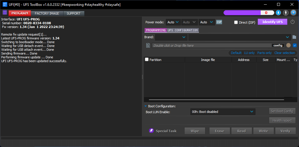 - UFS ToolBox requires UFI UFS-PROG with firmware version 01.34 to work properly.
